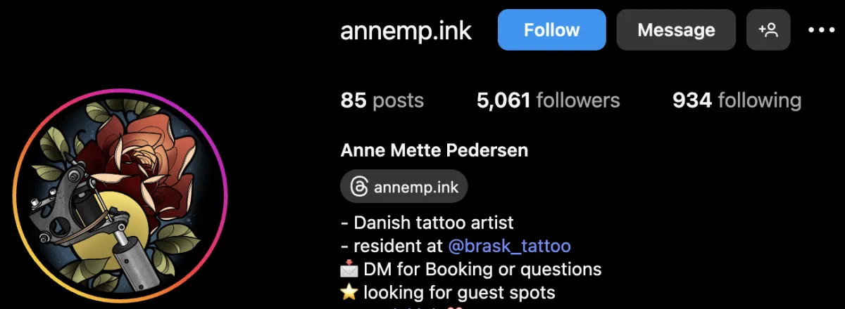 Anne Mette er kendt for sin evne til at forvandle idéer til tidløse kunstværker. Med mange års erfaring og et skarpt øje for detaljer skaber hun tatoveringer, der fortæller din personlige historie. Hendes arbejde balancerer elegant mellem klassisk sort-grå æstetik og levende farver – altid med fokus på kvalitet og følelse.