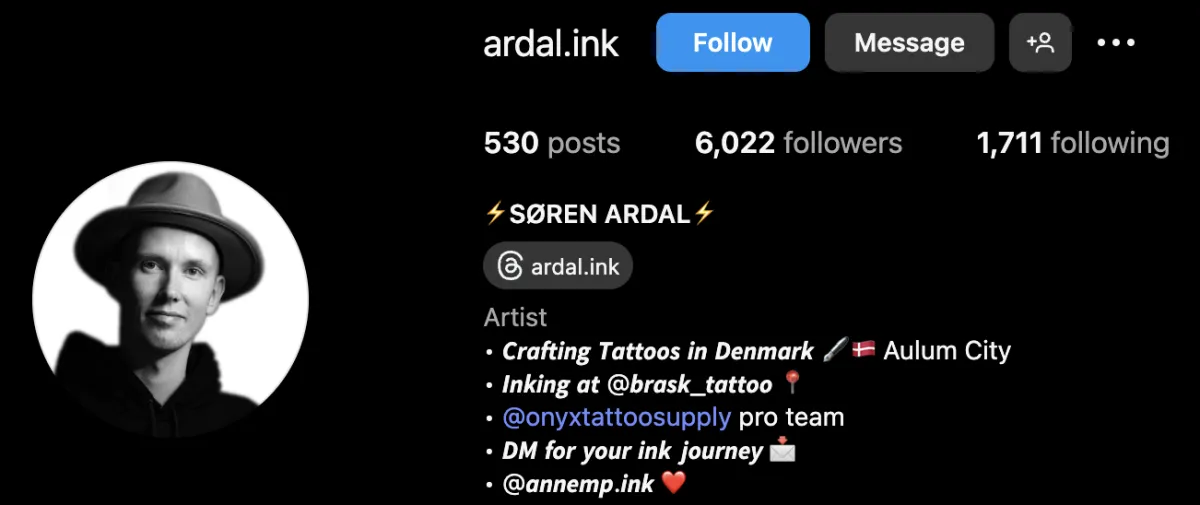 Søren Ardal begyndte sin rejse i Barcelonas graffiti- og tattoomiljø, inspireret af Spaniens puls og kultur. I dag er han en internationalt anerkendt tatovør med global erfaring. Hans stil er en fusion af realisme, fantasi og kreativ dybde – med inspiration fra både Japan, USA og resten af verden.